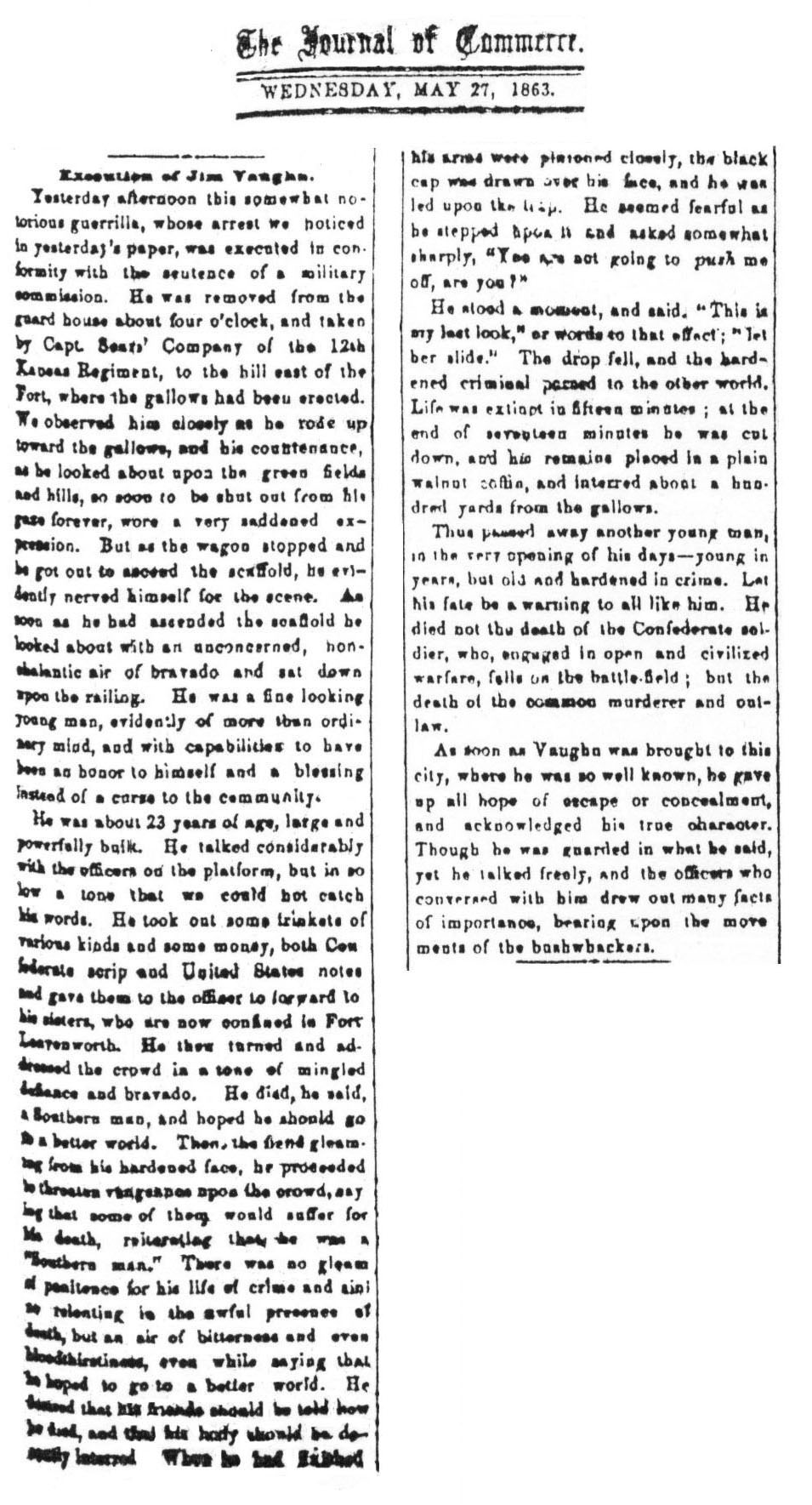 Daily Edition, Kansas City Newspaper Wednesday, May 27, 1863 Execution of Jim Vaughn Yesterday afternoon this somewhat notorious